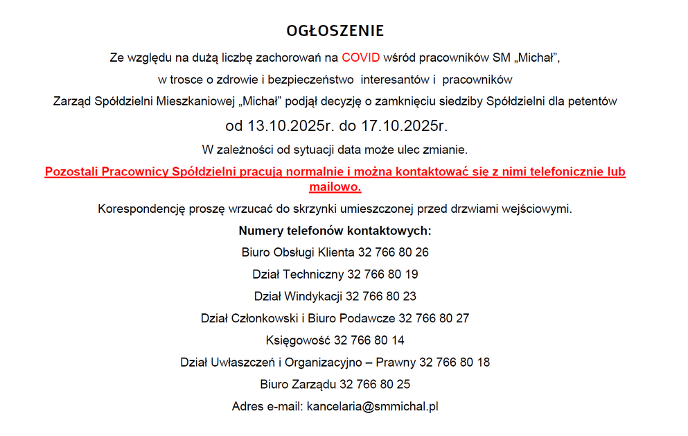 Uwaga! W nagłych przypadkach NARAŻENIA ŻYCIA I ZDROWIA LUDZKIEGO można zgłaszać AWARIE do MIEJSKIEGO CENTRUM ZARZĄDZANIA KRYZYSOWEGO 32 220 01 80 (całą dobę)